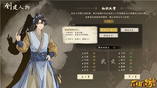 在游戏的开场设定中,你能像“骑马与砍杀”系列那样,精细地设定主角的出身与偏好,这让你既能效率优先,“捏”出一个武学天赋超群的少年天才,也能代入自己,随心创造一个既能精于杂学,也能颇具风骨的江湖才子。